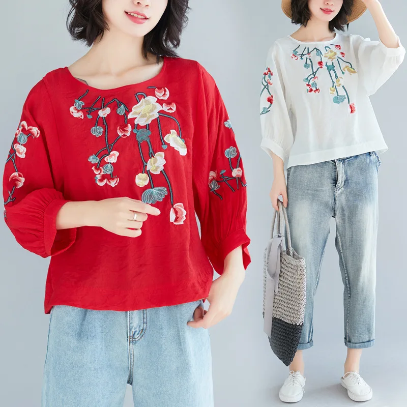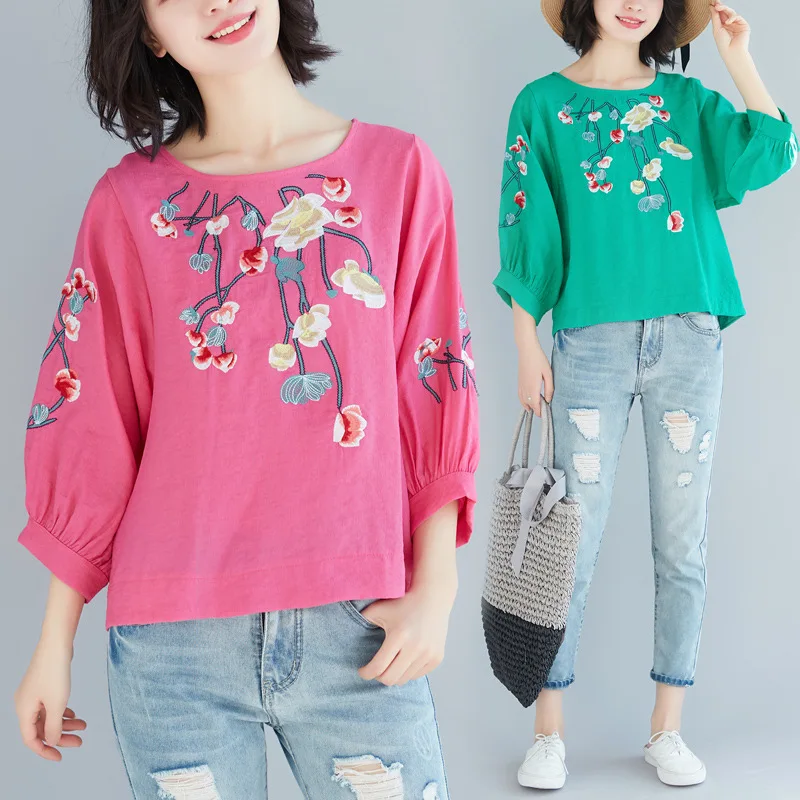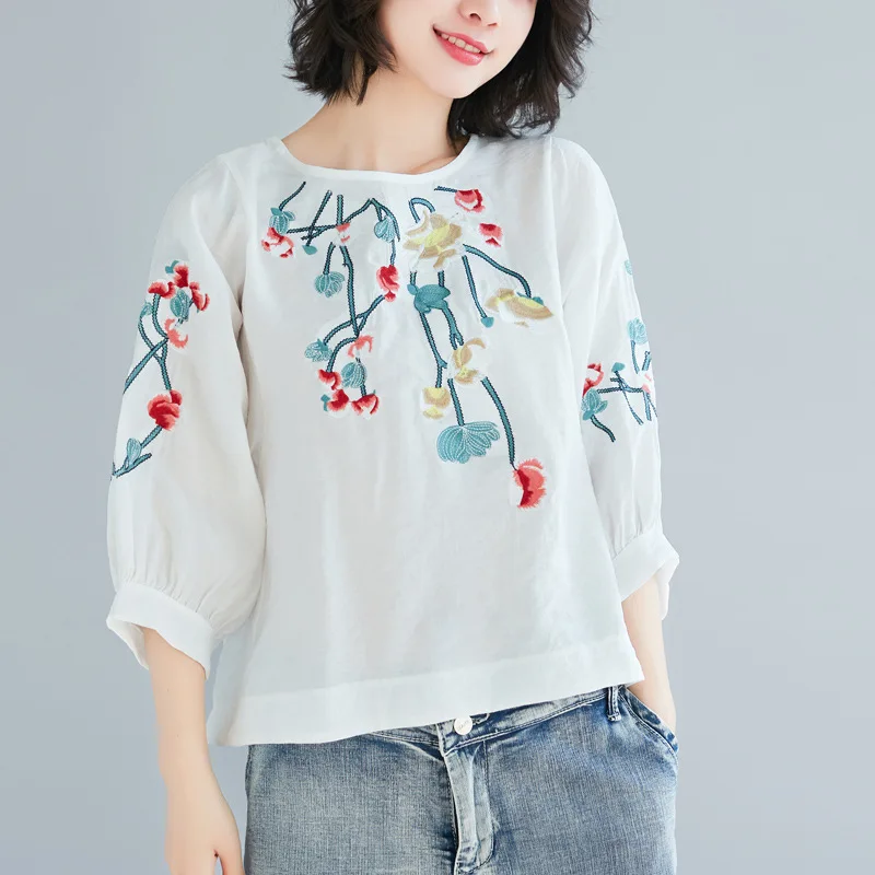 BEST Photo Shoot 2019 Spring Summer New Style Cotton Linen T-shirt Women's Artistic Embroidered Loose An